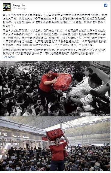 《法新社》一张红衣女为了登机高举红色行李跨过数百示威者的照片引起讨论,而这名女子的友人周三(14日)就通过面子书,分享整个历程。