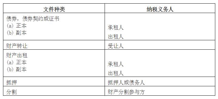 不同类型的文件适用的税率不同。印花税支付方根据文件中的条款确定,如果文件中对此未加以明确,则根据以下原则确定纳税人: