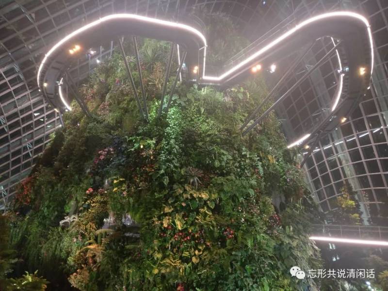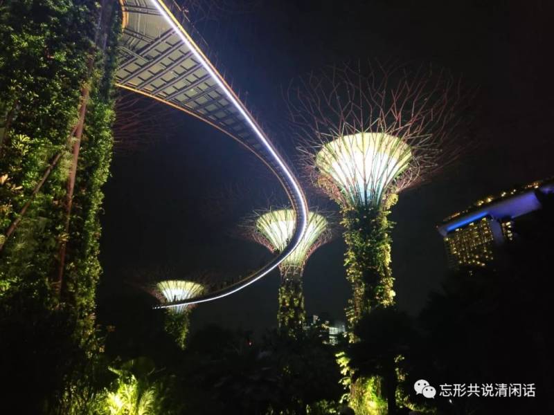 贝壳里面的繁花似锦和高空揽胜,真是一步一景、步步锦绣,配合灯光透视,明暗交错,更显立体与对比、突出与隐晦,比白天更加丰富多彩。最为震撼人心的是超级树的灯光表演,灯光随着音乐的变化而变幻,超级树间的凌空通道上人影绰绰,给人以仙人漫步的神奇。地下的人们密密匝匝,席地而坐,仰望天空,感受着这美妙的音乐和光影的律动。十五分钟的表演结束之后,人们摩肩接踵、流连忘返,徜徉在树下,回味着动人的表演。