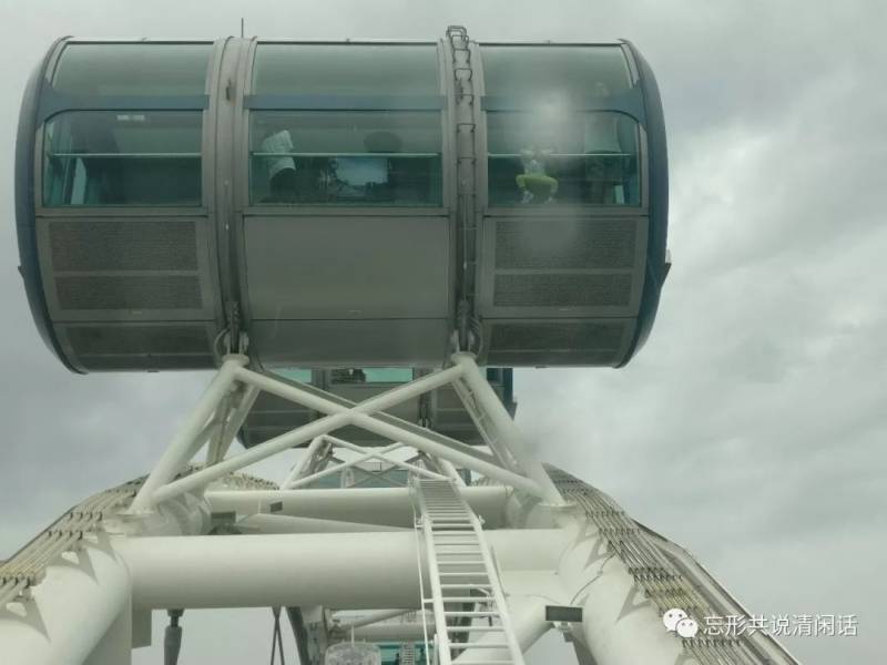 这时的雨大起来了,地面上湿湿的,买票排队。当我们七个人进入可容纳28名乘客的宽大的座舱时,先前担心的恐高已经是荡然无存了,因为它实在是稳固坚实,竟没有丝毫的动感。雨水顺着拱形的玻璃往下流着,影响了前后的视线,我们从两侧和下部的玻璃向外饱览著新加坡的美景,竟忘了自己身处高空。有的孩子在里面奔跑着、悬挂着,尽情地享受着他们的快乐。