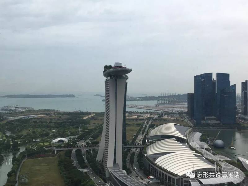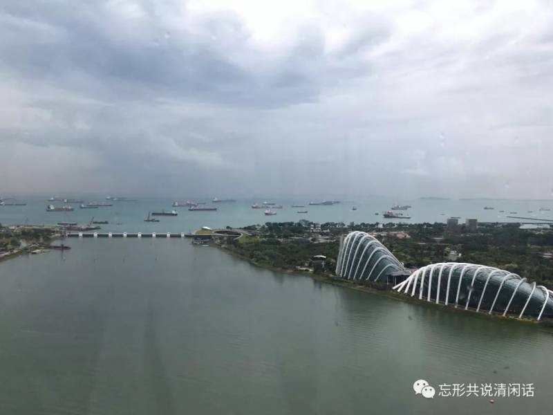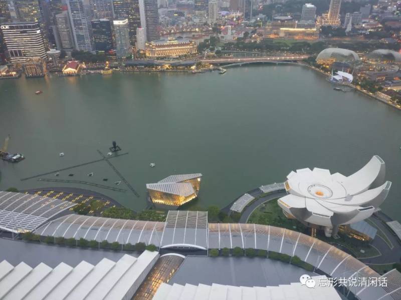 30分钟的时间很快到了,下了摩天轮,通过了模拟DNA修建的世界上首座双螺旋人行桥,来到了建在滨海湾金沙酒店空中花园的楼下。旱季的雨下个不停,18:30我们乘电梯来到56层楼的观景台。楼高再加上风雨,气温有点低,很多人围在入口或能遮挡风雨的地方等待天黑,远处的摩天轮上的灯光一闪一闪的,还没有全开。沿着高翘悬空的“船头”观景台行走,总有一种梦幻般的空虚感,加上地面湿滑,竟有了滑脱的幻觉。