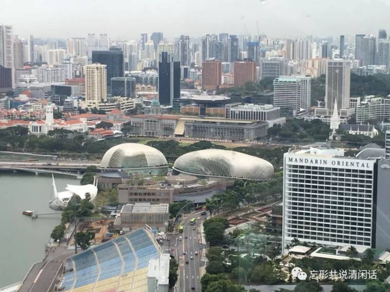 鱼尾狮的对面从左到右分别是滨海艺术中心、摩天观景轮、双螺旋桥、艺术科学博物馆和空中花园。从左面桥上过去,就到了双榴梿形状的滨海艺术中心,里面有绘画艺术展和即将开始的一场音乐会,乐师们提着自己心爱的乐器,三三两两奔向会场。出门后是一临水的音乐舞台,灯光设施齐备,随时都可以进行一场音乐会的表演。