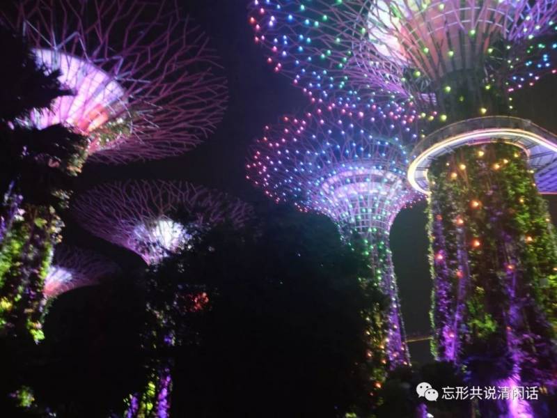 到了夜晚,华灯初上,多彩的世界,变换的灯光,真正的美轮美奂。有一个白人老人,在出口处的风雨中,一直等待着超级树的绚烂灯光,并对我们说:等一会儿它会亮的。但我们等到19:35还没有亮起来,就下楼了,太累了,还没有顾得上吃晚饭呢。