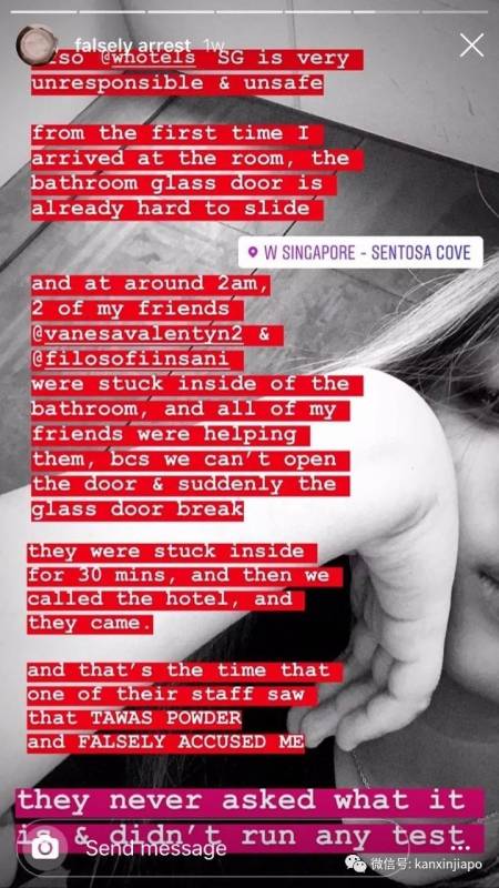 而且,更扎心的是,事后,W酒店还要求她们支付1700新币,因为他们将厕所玻璃弄坏了......不过好在警方最终确认那些粉末不是毒品,最终放他们离开。