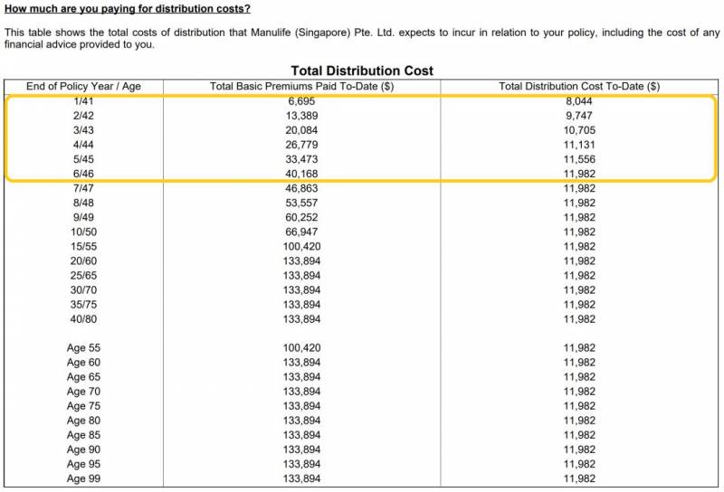 从上表我们可以看出,客户缴纳的总保费为133,894新币,而这份保单的总分销成本为11,982新币,占总保费的8.95%,分成6年支付给销售渠道,每年递减。