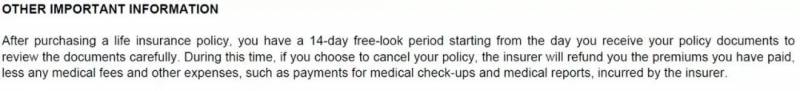 “在购买人寿保险后,您将在收到保单文件之日起,享有14天的免费审阅期,以便仔细查看文件。在此期间,如果您选择取消保单,保险公司将在扣除任何医疗费用后,退还您已支付的保费。”