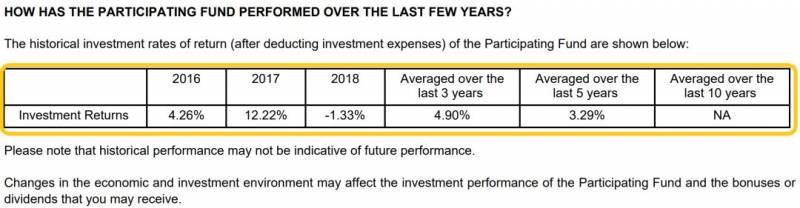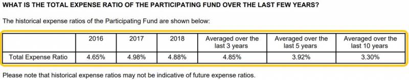 介绍了“投资风险”和“费用风险”对于分红可能产生的影响之后,新加坡的保险公司依照监管要求也必须在保单计划书中披露过往3年每年的分红基金实际表现以及过往的实际运营费用,以及过去3年、5年和10年的平均值。