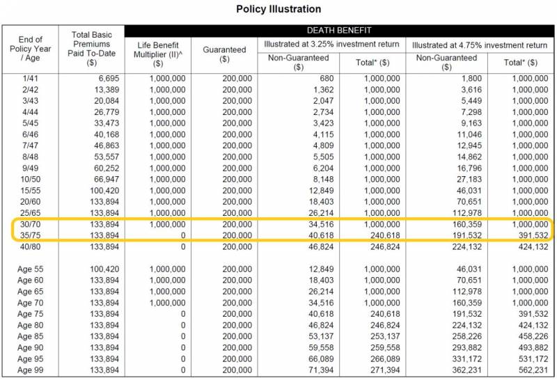 本文使用的例子是比较常见的终身寿险保单(选取新加坡宏利公司的LifeReady Plus产品),以40岁不吸烟男士举例,身故和全残保额20万新币,Multiplier选择5倍,20年缴。(不清楚Multiplier是什么的朋友可以参考我之前的文章:终身寿险里的“Multiplier”是个啥?)