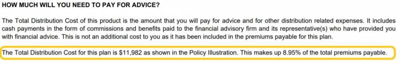 保单计划书中同时对总分销成本做出说明,即它是“您所需要支付的咨询费用和其他相关的分销费用。它包括以现金支付给为您提供财务咨询的财务顾问公司及其代表的佣金和福利”。