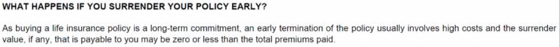 “因为购买人寿保险是一项长期承诺,提早终止保单往往需付出很高的代价,付给您的退保价值(如有)可能为零或低于已支付的保费总额。”