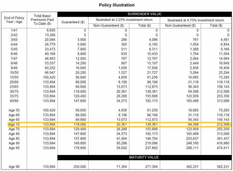 另一方面,这份保单的退保价值逐年升高。假设受保人70岁时退保,保证可以拿回11.8万新币退保价值;如果假设分红基金每年都按4.75%的投资收益率来分红,此时保证加非保证的退保价值则是212,598新币。