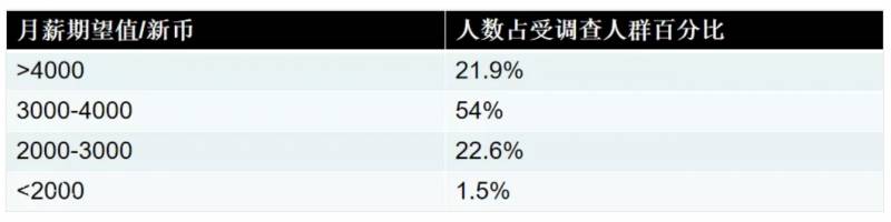 根据奖学金咨询网站BrightSparks的调查,有54%的新加坡学生期望自己进入工作岗位后的每月薪水在3000-4000新币之间。