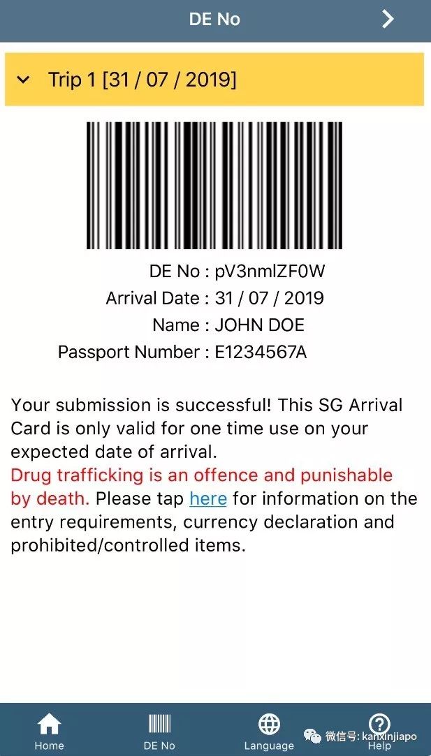最后抵达新加坡通过海关入境时,只需要掏出手机出示此条形码就可以了。