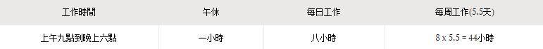 合约内的每周工时(不包括休息时间及超时工作)不能超过44小时。包括超时工作在内,你每天的总工作时数不能超过12小时,每月的超时时数也不能超过72小时。
