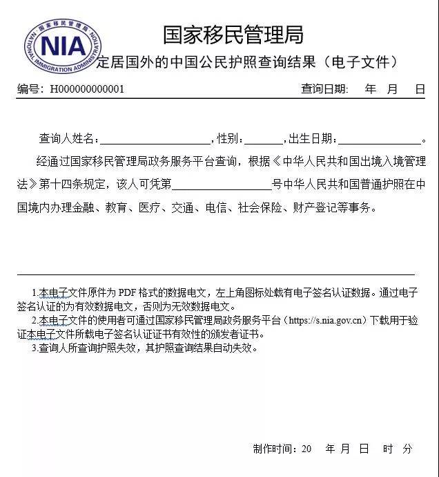 定居国外的中国公民护照查询结果(电子文件样图) 有了可以核实认证的机构平台与机制,华侨可以拿着用本人护照,去办理交通运输、教育、通信、住宿等公共服务事项,并实现自助或网上办理!