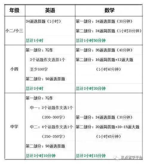 年级不同,相对应的考试内容也不尽相同。不过万变不离其宗,考试科目只有两门:英语和数学。