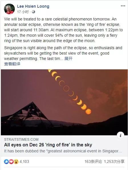 高达40米的雨漩涡,是“世界最高的室内瀑布”。 2019年的星耀樟宜,是全世界最值得去的 最豪华、最智能、最丰富多元的机场。 4 212年一遇的日环食 如果说星耀樟宜是的“值”, 是人为的“值”, 那么今年,还有自然界送来的, 212年一遇的“值”——新加坡日环食, 连李显龙总理也沉迷其中。