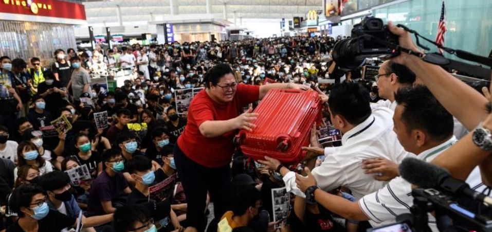 新加坡游客在香港机场被阻拦, 最后只能强行翻越人墙才得以回国。
