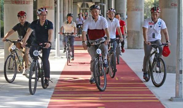 并且身体力行地做出示范,带领大家在宏茂桥新建的自行车专用道上骑行。