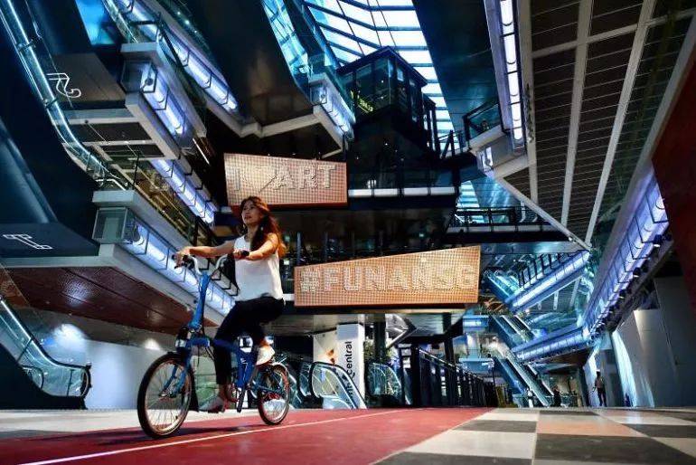 另外,去年重新装修开业的福南商场(Funan),在一楼大堂设计了一条自行车专用道,让大家可以直接骑自行车穿越商场。
