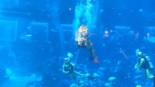 在S.E.A.海洋馆打破吉尼斯纪录的巨大水族观景窗前,看威武霸气的蛟龙从天而降,在4万只海洋生物的陪伴下,跟着音乐翩然起舞。
