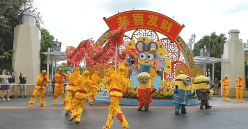 游行最后,换了一身唐装的小黄人惊喜亮相!千万别忘了和他们合照,只有农历新年期间才可以看到这样的限定版造型呢~