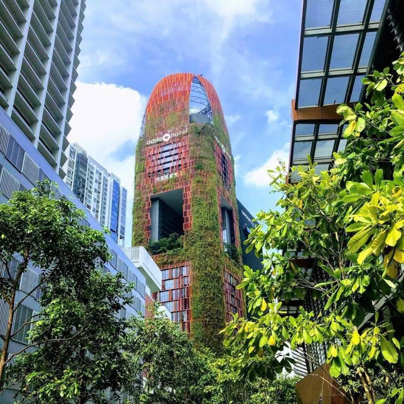 酒店大楼外墙以垂直绿化形式装饰绿植一派绿意盎然的景象宛如一条闹市中倒挂的瀑布为闷热的坡岛带来无限凉意与生机