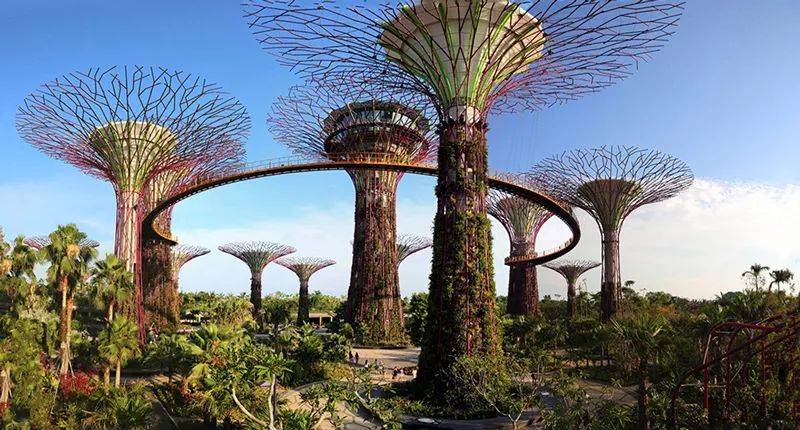 上面攀缘葱葱郁郁的植物还有长达百米的空中步道游客们站在上面可以鸟瞰整个花园和滨海湾一带的景色