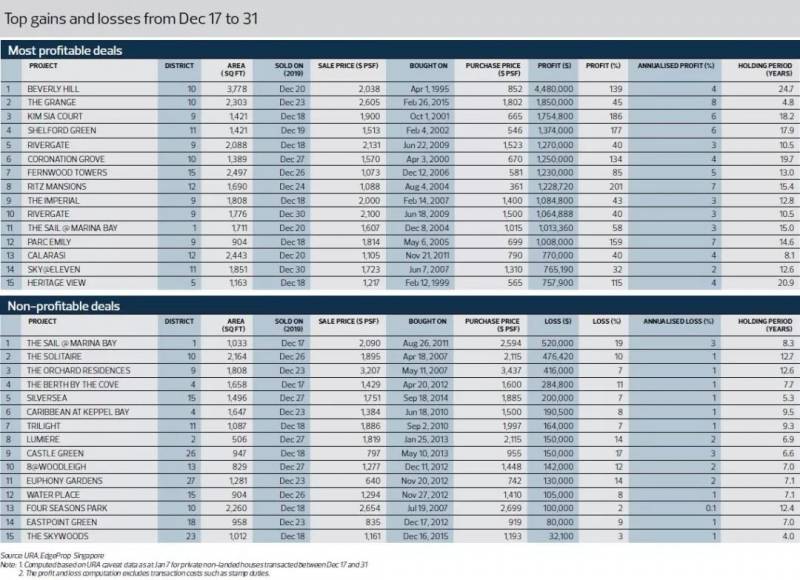 新加坡(EDGEPROP)——截至2019年,12月17日至31日这两周最赚钱的一笔交易发生在格兰芝路(Grange Road)的Beverly Hill公寓。12月20日,一套位于第八层面积3,778平方英尺的四卧室公寓以$770万(每平方英尺$2,038)的价格易手。它于1995年4月以$322万(每平方英尺$852 )购得。因此,业主获得了$448万(139%)的利润,即近25年内4%的年利润。