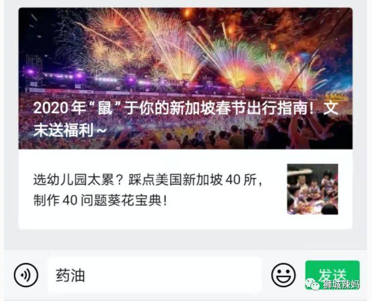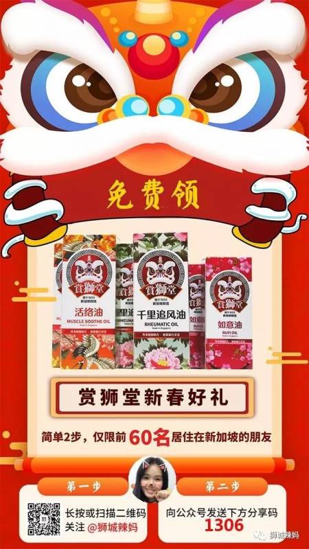 辣妈新年福利到! 新春佳节到了,怎么会少了粉丝福利呢?单支最高价值$16.5新币,礼盒最高价值$99新币的新加坡药油奉上! 只需要按照以下步骤就可以领福利了,先到先得哟! 1.扫码关注“狮城辣妈”公众号