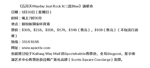 8月30日,五月天将在新加坡国家体育场举行《五月天Mayday Just Rock It!!!蓝Blue》演唱会,这是五月天为感谢粉丝20年相伴,重返国家体育场开唱,与粉丝相约回到大家初次相遇的时光。