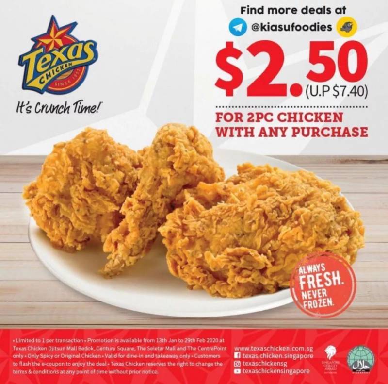 喜欢大块吃肉?坡坡的Texas Chicken最近推出了炸鸡优惠,原价$7.4的两块炸鸡现在$2.5就可以吃到!酥脆的外皮包裹着多汁的鸡肉,咬下去满满的幸福~多家门店都有活动,截止时间为2月29日,路过的小伙伴不要忘记买上两块哦!