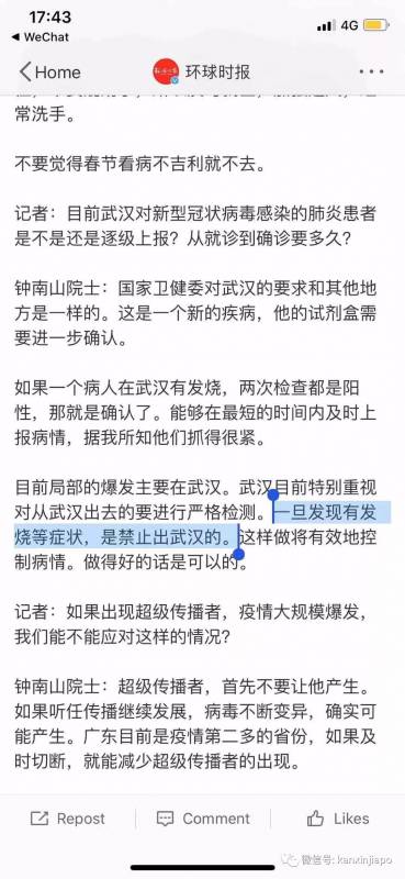 中国呼吸道疾病专家锺南山透露,只要有人出现了发烧症状,将不被允许离开武汉!