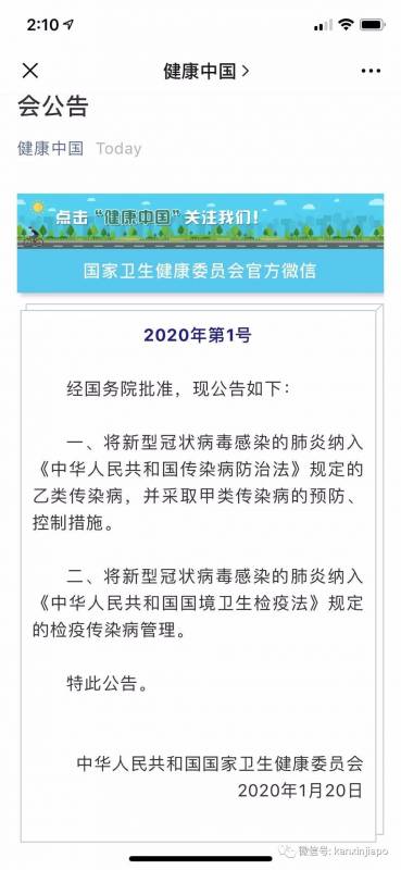 而中国国家卫生健康委,今天发表公告决定将“武汉肺炎”纳入法定乙类传染病,并采取甲类传染病的预防、控制措施。