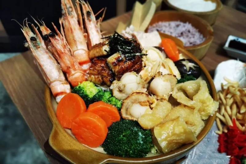 烤鳗鱼、大虾、干贝、鲍鱼、鱼鳔和西兰花胡萝卜香菇等配料用人参鸡汤和骨汤打了底,煮了六小时,煮出了一份颜值高味道赞的特色盆菜,喝一口汤,真鲜!