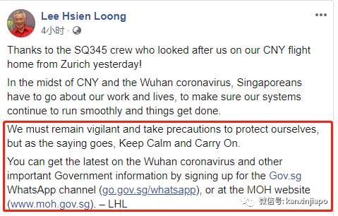 面对新疫情,李显龙总理在脸书上表示大家要“保持冷静,继续前进”,并提醒公众可通过Gov.sg、新加坡卫生部MOH主页了解疫情最新信息。