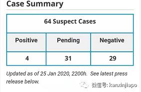 目前,新加坡一共发现64例疑似病例,其中29例新型冠状病毒检测呈阴性,4例检测呈阳性,其余31起测试结果待定。