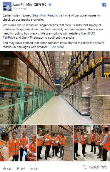 下午5点半,交通部兼卫生部高级政务部长蓝彬明医生(第四代领导人)也在面簿上分享他视察职总平价合作社仓库检查口罩存货的照片,并写道: “我们想向新加坡人保证,新加坡的口罩供应是足够的,前提是大家必须明智地、负责任地使用口罩。
