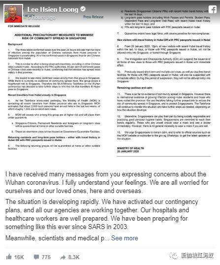 身为第三代领导人的李显龙总理傍晚6点25分也发面簿帖文写道: “我收到了你们给我发来的无数条留言,知道你们对武汉肺炎疫情极为关注。我完全能理解你们的心情与感受。我们大家都很担忧自身以及本地与海外亲人的安危。疫情的局势在迅速发展。我们已经启动了应急机制,各大机构都在携手合作。所有医院和医护人员都已做好准备,我们自2003年的沙斯爆发以后,就一直未雨绸缪,以便应对这类疫情。” 李显龙接着在帖文中说明了几点,提醒大家做好心理准备。