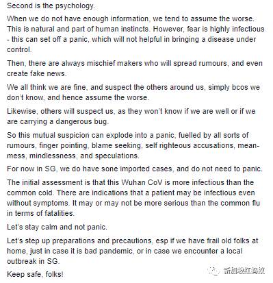 这种互相猜忌会爆发成恐慌,加上各种谣言、指责、怪罪、所谓正义的指控、卑鄙行为、无知和猜测,更乱上添乱。 “在新加坡,我们确实有些进口病例,但仍无须恐慌……让我们保持冷静不要恐慌。让我们加强准备工作更为谨慎,尤其是当我们家中有体弱的老年人的时候。这样就能为疫情爆发、或者本地出现社区传播作好准备。大家,保持安全!”