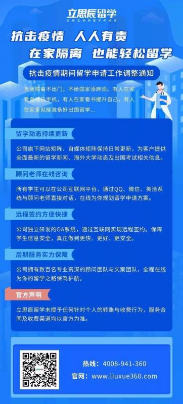 为配合国家防控冠状病毒有关举措,保护广大留学人员生命安全和身体健康,遏制疫情蔓延势头,立思辰留学针对抗击疫情期间留学申请工作调整通知如下: