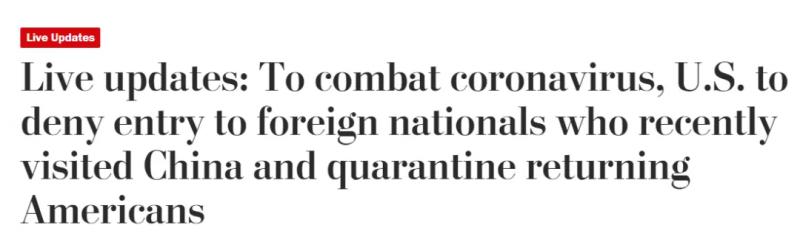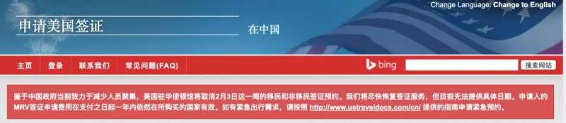暂时停止赴美的所有签证 具体恢复时间为待定。 生效时间为:2月3日-2月7日 许多即将美签的学生 赴美工作、赴美探亲的华人均受影响!