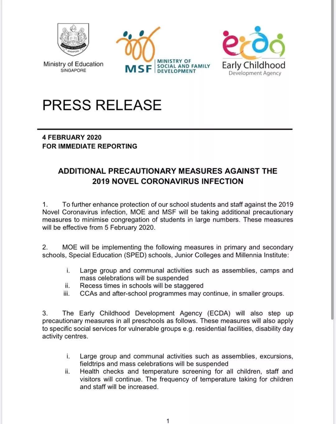 根据教育部规定,幼儿园、小学、中学、特别教育学校、初级学院及励仁高中,从今天(2月5日)起开始暂停升旗礼、周会、露营、集体庆祝会等大型群聚活动,学生休息时间将会错开,课外活动则以小组进行。