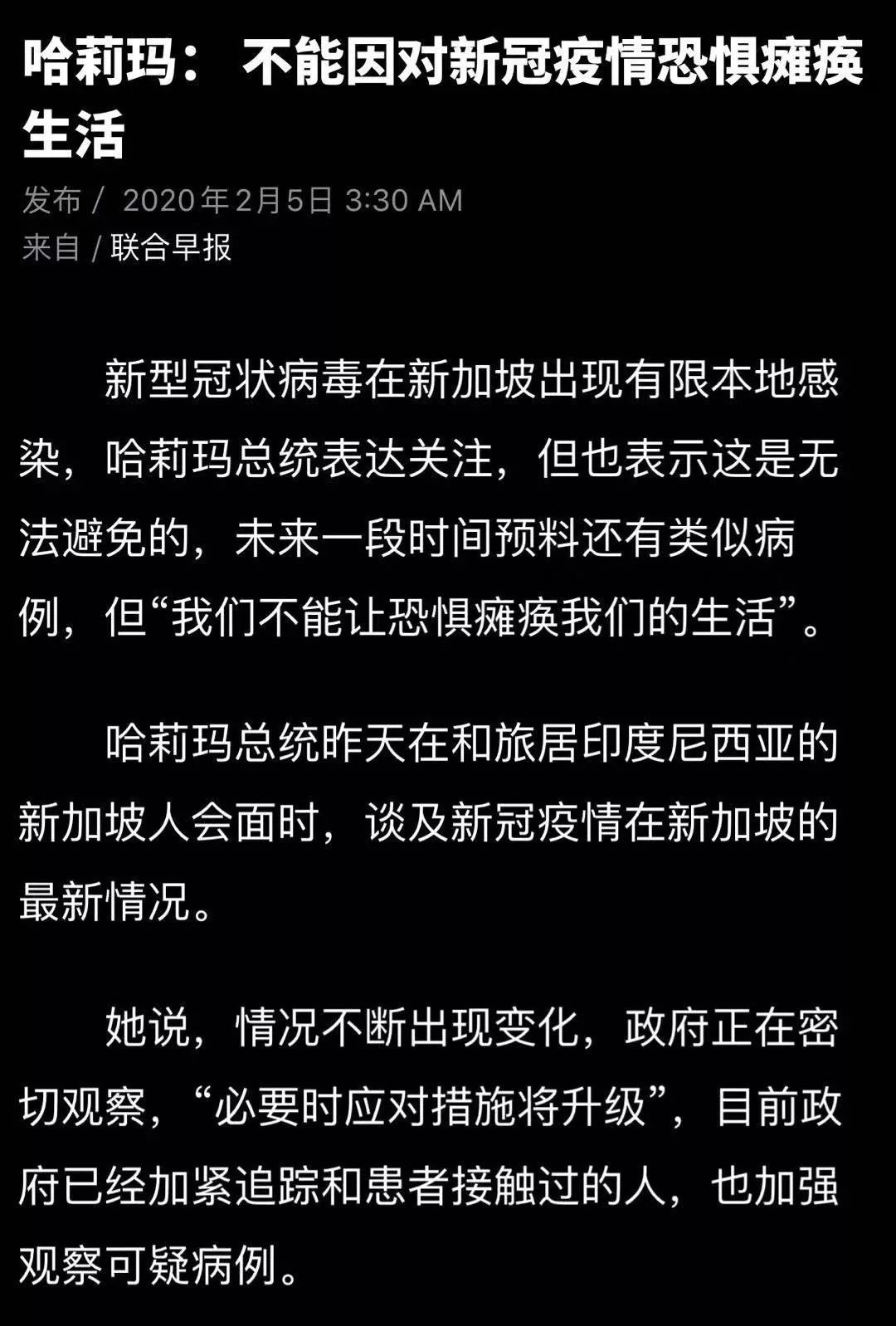 新冠状病毒在本地的局部传播,新加坡总统哈莉玛也表达了关注:我们不能让恐惧瘫痪我们的生活,情况在不断变化,政府也在密切观察,必要时应对措施将升级,目前政府已加紧追踪和患者接触过的人,也加强观察可疑病例。