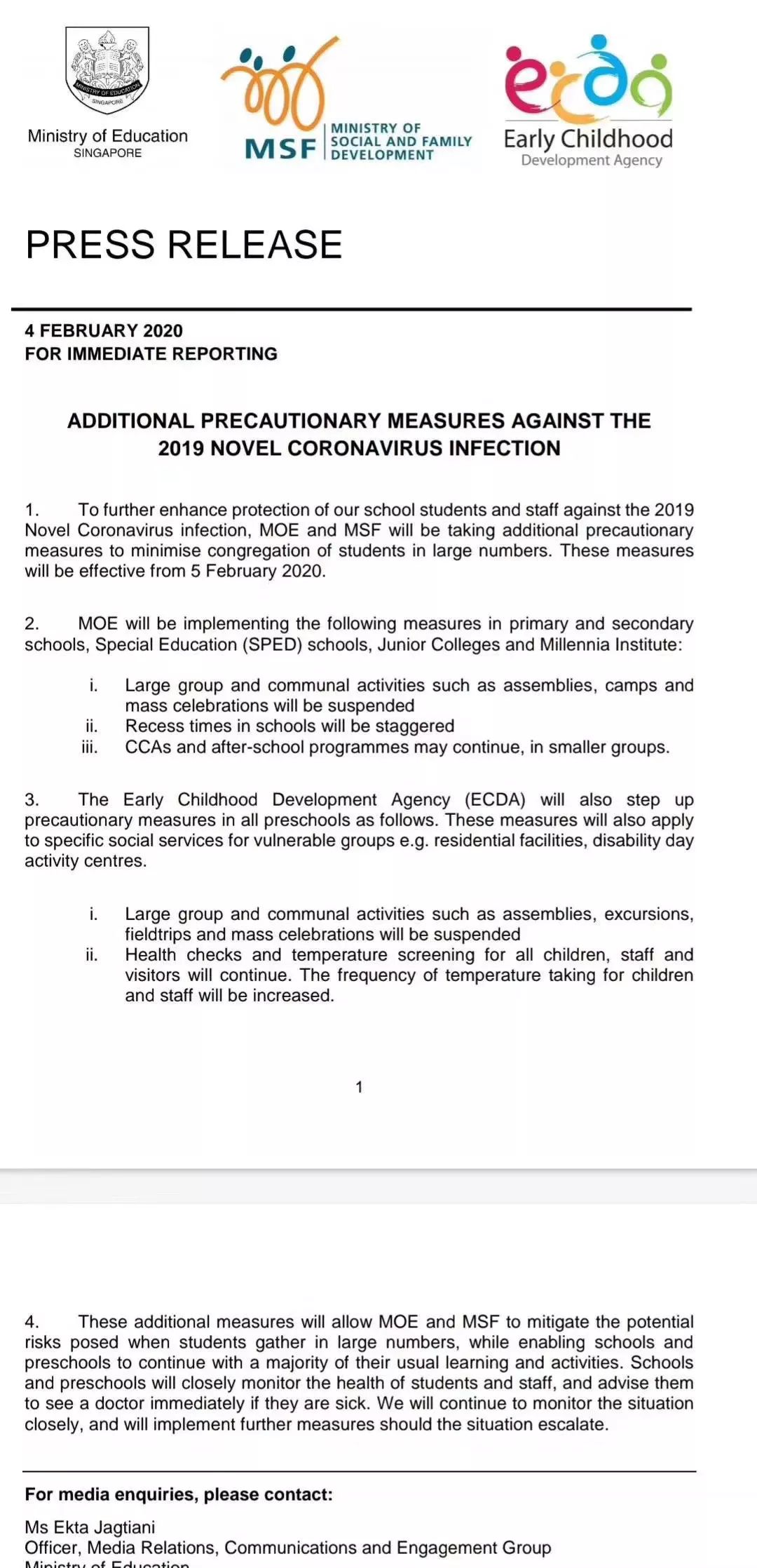 通告原文是这样说的:幼儿园、小学、中学、特别教育学校、初级学院及励仁高中,从今天开始暂停升旗礼、周会、露营、集体庆祝会等大型群聚活动,学生休息时间将会错开,课外活动则以小组进行。