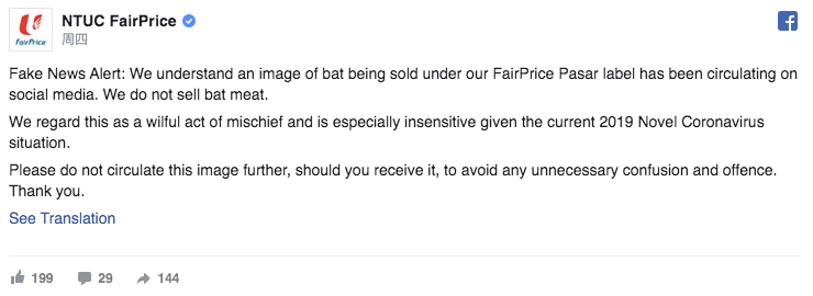 很快,超市出面澄清,自己并不售卖蝙蝠肉。而后有一名学生设计师出面解释:这是自己“因为好玩”而创作的图片。 目前这名学生已经将图片从Instagram上删除,超市则呼吁民众不要再传播这张“谣言”图片,疫情当前,开不得这样的玩笑!