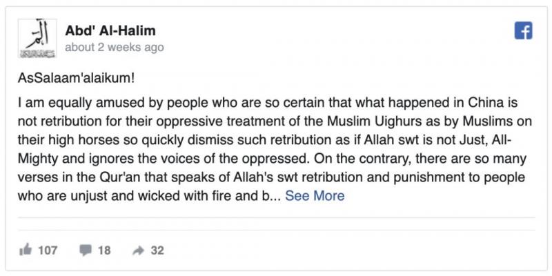 据本地媒体报导,宗教老师阿都哈林(Abdul Al-Halim)1月29日在Facebook贴文称,武汉肺炎疫情是阿拉给予中国迫害维吾尔族穆斯林的报应。
