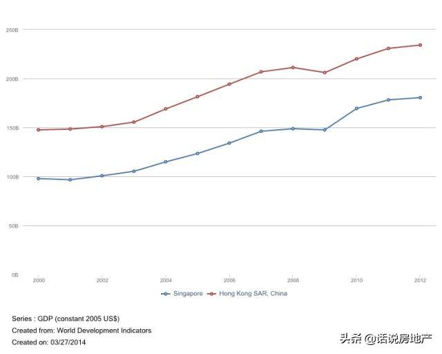 这就为我们讨论新加坡和香港 GDP 问题提供了一个思路。下图是新加坡和香港两地的名义 GDP 对比图。从图上看,新加坡 GDP 在经历两千年初期的短暂调整后,从 2004 年增速快过香港,并终于在 2012 年超过了香港。(data source: World Bank)