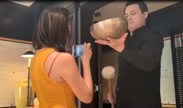 第二步,他左手拿着一个小铜盆(Singing Bowl),右手拿着一根棒子,他先用棒子敲打我所在的大铜盆边缘三下;