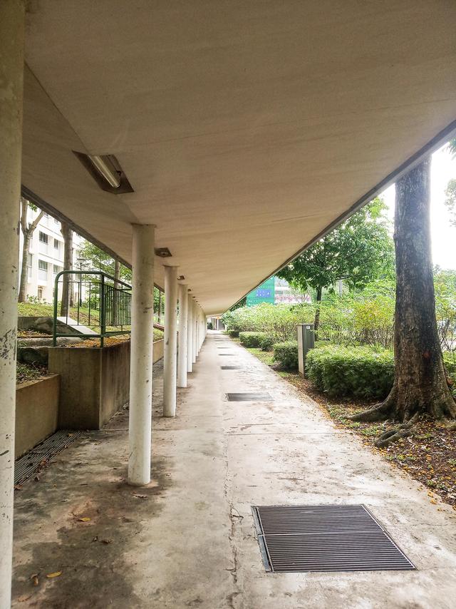 这条路线很绕,中途停靠站点太多,原本打车不过14分钟的路,坐公交花费了一个小时。好处是,可以看到和市中心完全不同的新加坡街景,比如中式或者泰式风格的寺庙,军营附近车站等车的军人,一些和上海老公房类似的没有阳台、晾衣架伸出屋外的居民楼,还有下车之后,随处可见的走廊,方便下雨天人们从车站走到建筑内部。